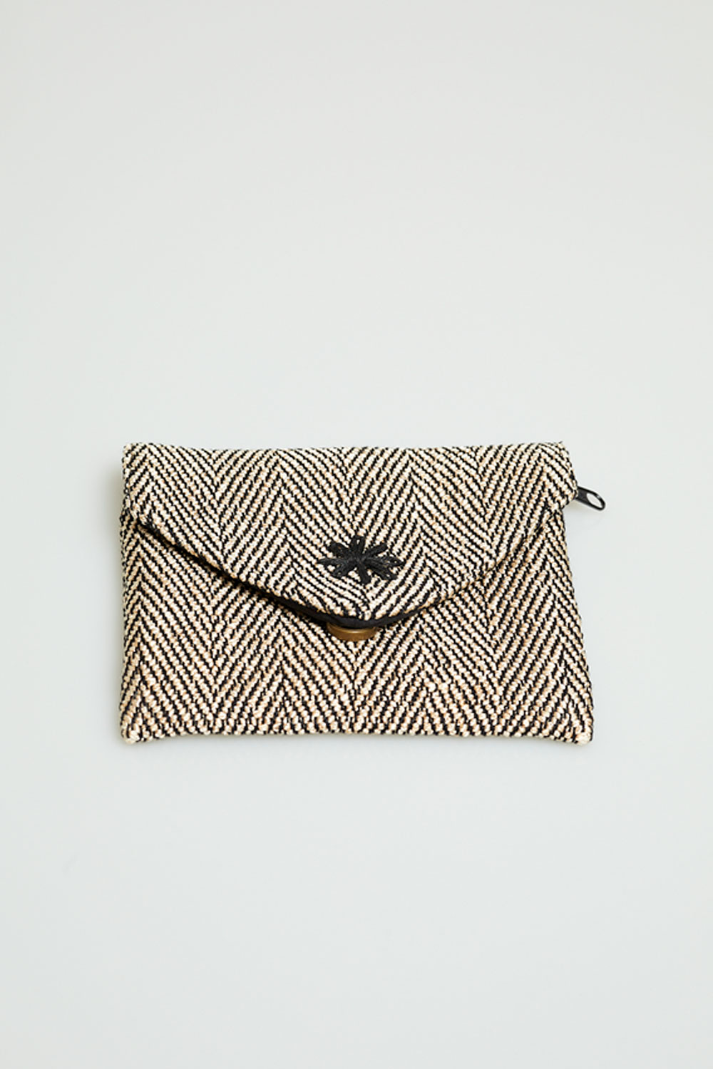 Carterita pequeña tejida en telar tradicional, en dorado y adorno bordado en negro. 13 cm de largo y 11cm de alto con broche de cierre a presión imantado forrada en tejido negro de algodón por dentro y con cremallera interior